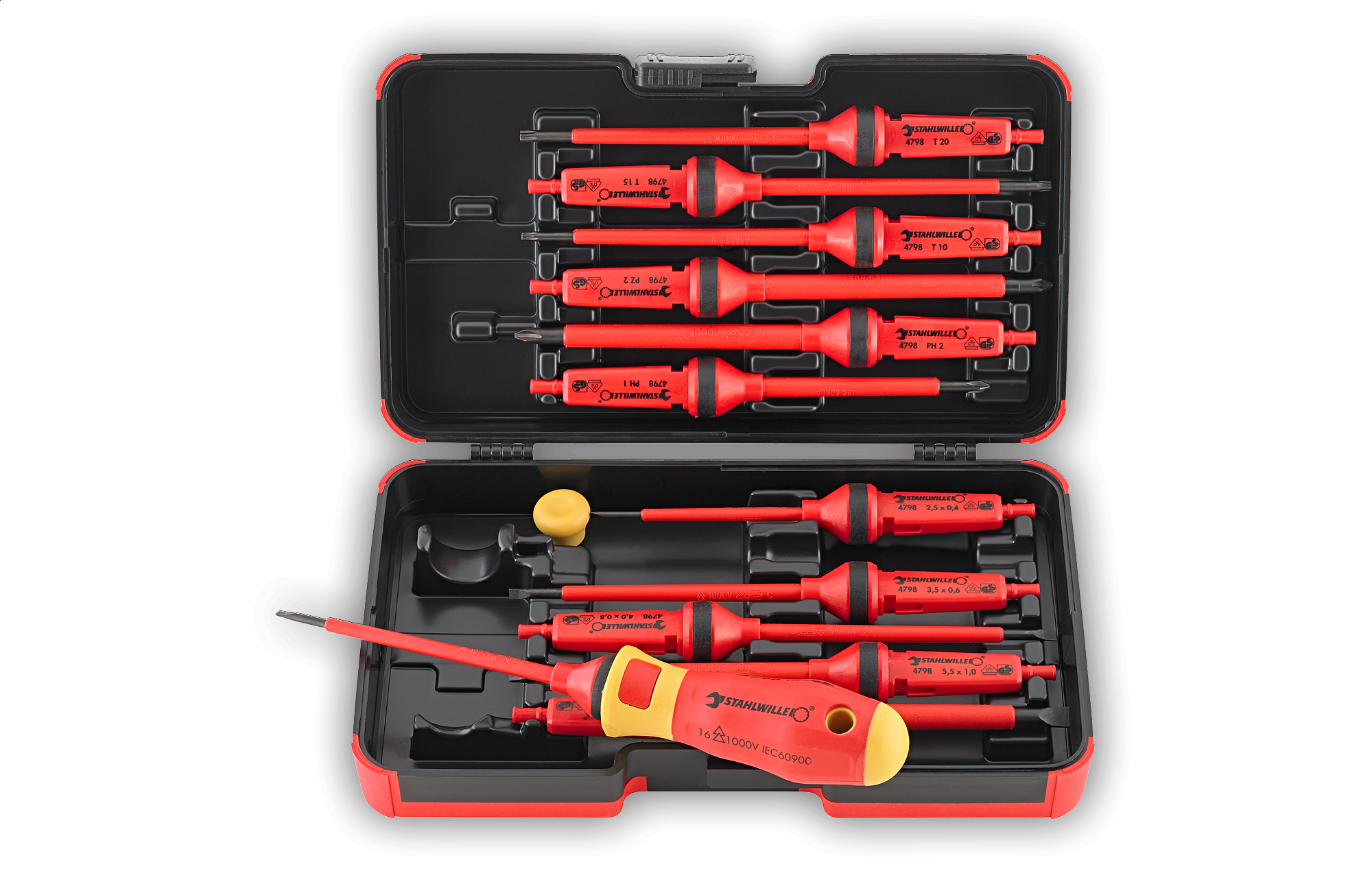 Sada elektrikářských šroubováků s ergonomickou odnímatelnou rukojetí v praktickém plastovém kufříku. Šroubováky jsou určeny pro práci pod napětím do 1000 V.